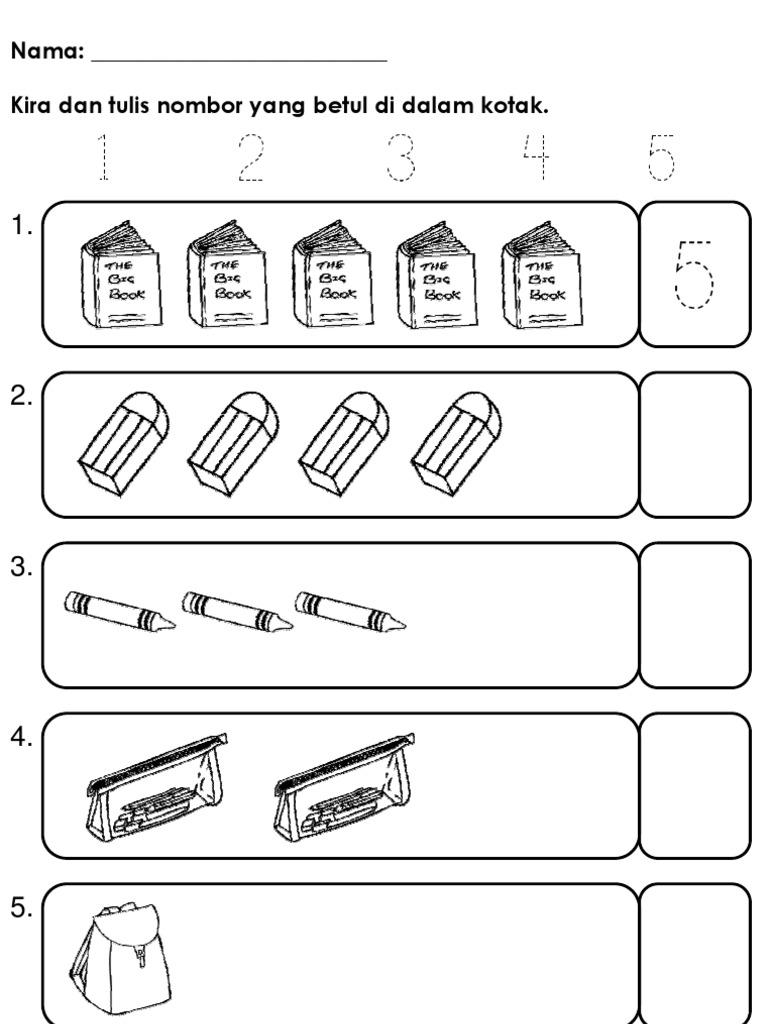 Tadika Prasekolah Tahun 1 Matematik Mengira. Lembaran Kerja Latihan Kata Nama Khas Tahun 1. Nombor 1 hingga 10 kitpramenulis 5.